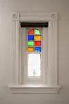 2.5.26Indoors and OutHad an apartment shoot this morning that took me to a building in Ludlow, KY. Two of the apartments featured lovely colorful stained glass windows (pictured) that enlivened the room considerably. With these being monochromatic, empty apartments, a bold splash of color like this adds a strong sense of character that makes the mood in the room considerably warmer and brighter than the dreary cold beyond. I managed to photograph someone crossing the street as I lined up for a straight shot on the tiny window.